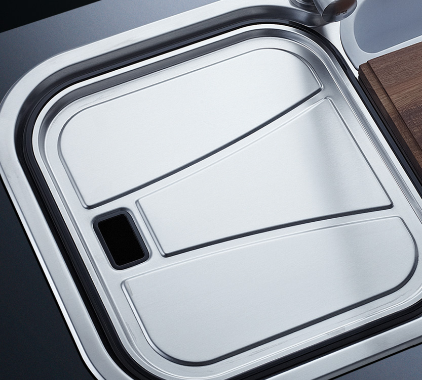 槽底采用斜面壓痕,四輻導流槽設計,與平面壓痕和無痕水槽相比,導水更為流暢,下水更迅速,能有效防止積水,消除沉淀物