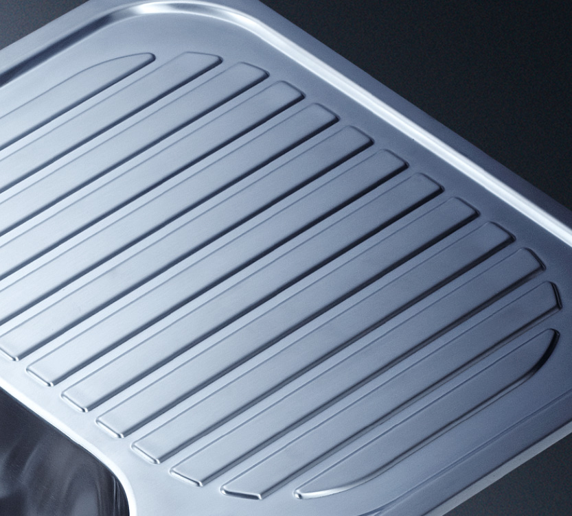 水槽四邊條采用一次成型的折彎加強筋工藝,雙倍堅固,承重力更強,解決了普通焊接工藝容易出現的凹點、脫焊、易割手等問題。專業配置的密封條和固定夾,安裝平整度高,不滲水,不松動
