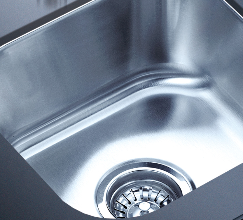阿發水槽整體經拉絲處理,質地更加光滑,視覺更加柔和。能有效抵擋異物撞擊,刮傷及磨損,防止油污沾染,常用常新;柔和的光澤令水槽平添高雅氣質,更能避免鏡面材質反射的光污染